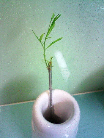 流れ星だったのだろうか? それにしては、市販の黄色っぽい緑色の打ち上げ花火みたいにも見えた。 でも音はしなかったし・・・それに、それが見えた方向には、そんな場所も無い。 しかも、上から下に落ちていったし。 んー・・・???人魂!?(((( ;゜Д゜)))なワケないしヾ(-_-;) オイオイ... たぶん、流れ星だったって事で。しらです。人魂だったらガクブルです。 ところで、お正月飾り用に購入したアレンジメントのお花に飾りでついてた、 名もわからん小枝に、シルバーの塗装がされてたヤツがあるのですが、 なんかその小枝が生きていました。 すごいニョキニョキと育っているのですが・・・ しかも、下の方から・・・ 根もしっかり出てきてる・・・・・ さて、ここで問題。 この名もなき小枝、あなたなら何か判明するまで育てますか? それとも、なんだかあまり育ちすぎても困るからポイしますか? 今、すごく悩んでおります。 「ウチの庭(ベランダ)が森になったら素敵!」とか、 『となりのトト○』のさ○きちゃん風な考えはこの際置いといて、 いやホント、どうしようかな。 とりあえず、もうしばらくはこのまま水栽培で様子をみようかと思います。 育ってから、何かやっぱり捨てておくべきだった的な木で無い事を祈りつつ。。。 スーさまが吸ってるタバコってKENTなんだなーと、